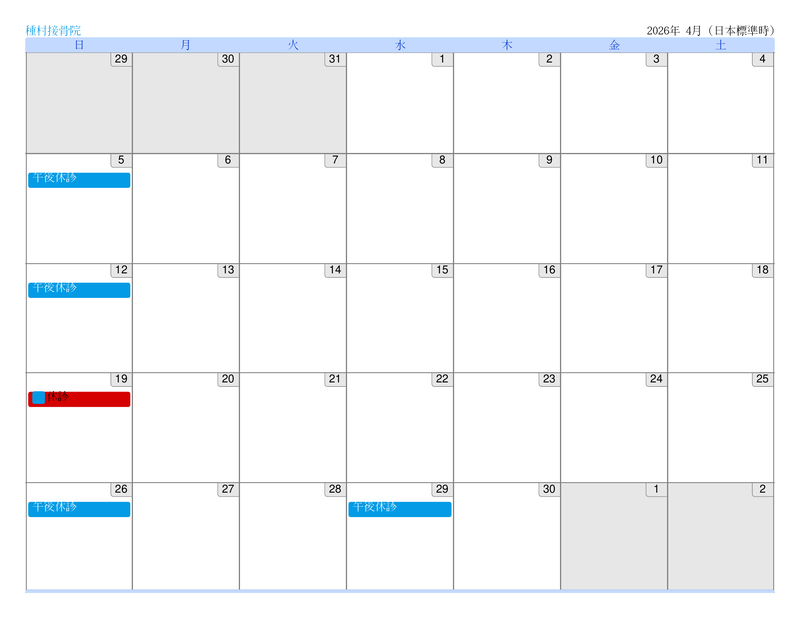 2026.03.19 お知らせ 【4月の営業について】 4/19(日)は終日休診です。4/29(水)は午前中のみ営業します。よろしくお願いいたします。営業カレンダーはこちらから↓https://tanemura-care.com/ご予約はこちらから↓https://tanemurasekkotuinn.re-works.net/reserve/ PDFを開く